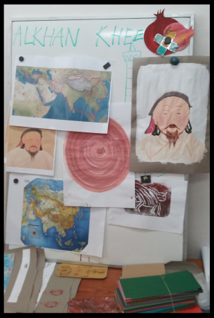 In August 2015 we made all the way as Marco Polo did from Venice to court of Kublay Khan. We took a boat across the sea to Jerusalem, visited Armenia and Persia, saw reclining Budha in Afganistan, traveled through Pamir Peak and Taklamakan Desert until we reached the rich court of Mongolian Empire. During the journey every child was making its own diary. We tried Persian illumination, designed our own paper money and created a golden paiza – passport in the 13th century. Strange creature in the desert (engraving in the foam) – Marco Polo met many strange animals he has not seen before. Camels in the desert – we were using real spices so Muddum smelled like Arabic spice shop. Mongolian horses made out of clay and a lion which is still on the St. Mark’s Square. We challenged ourselves and tried to build Mongolian yurt and clay minarets. Portrait of the big Kublay Khan (tempera) All together we built famous Marco Polo Bridge in Beijing